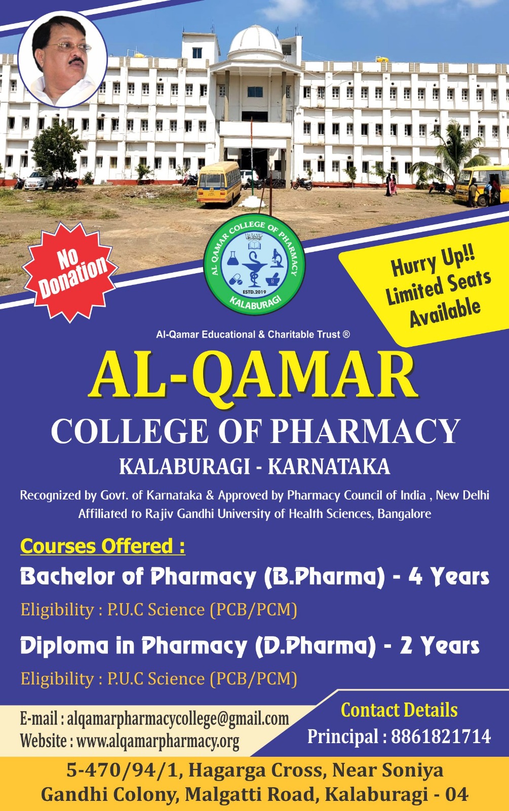 Al-Qamar College of Pharmacy, Kalaburagi was established in the year 2019 under Al-Qamar Educational & Charitable Trust's(Regd). Our college is affiliated to Rajiv Gandhi University of Health Sciences, Bengaluru; approved by Pharmacy Council of India (PCI), New Delhi and All India Council for Technical Education (AICTE), New Delhi.